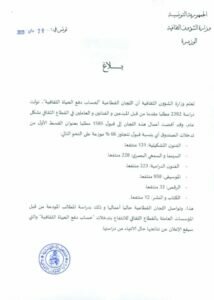 هذا، وتواصل اللجان القطاعية حاليا أعمالها و ذلك بدراسة المطالب المودعة من قبل المؤسسات العاملة بالقطاع الثقافي للانتفاع بتدخلات “حساب دفع الحياة الثقافية” والتي سيقع الإعلان عن نتائجها حال الانتهاء من دراستها.