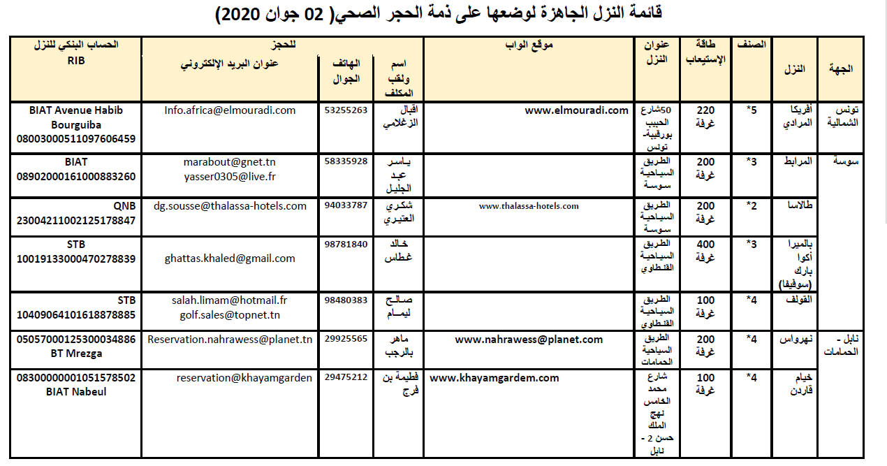 تم تحديد القائمة الاسمية للنزل المصاحبة المزمع استغلالها كمراكز للحجر الصحي الإجباري، من أصناف 3و 4و5 نجوم طبقا للتعريفة التالية بالنسبة للشخص الواحد.