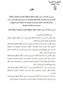 مقرّر من وزير الدولة لدى رئيس الحكومة المكلف بالوظيفة العمومية والحوكمة ومكافحة الفساد مـؤرّخ في 06 جوان 2020 يتعلّق بضبط إجراءات ونسق العمل بالنسبة إلى أعوان الدولة والجماعات المحلية والمؤسسات العمومية ذات الصبغة الإدارية والهيئات والمؤسسات والمنشآت العمومية.
