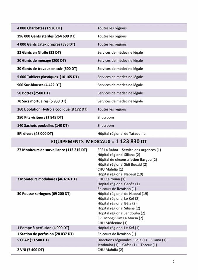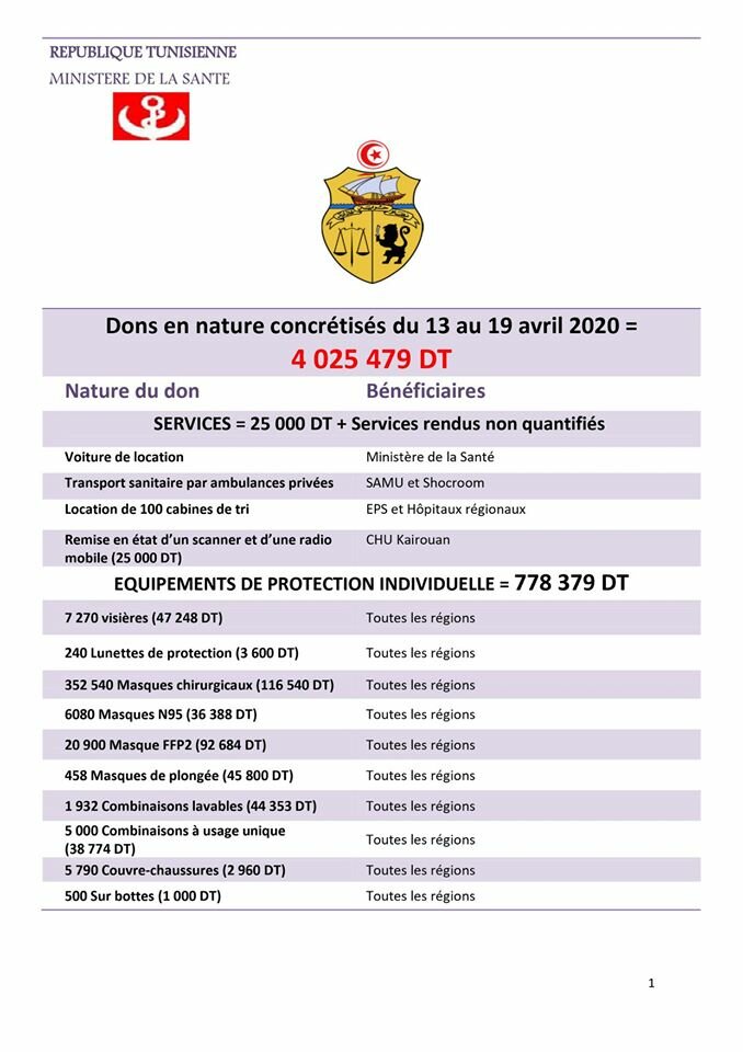 La commission des dons du Ministère de la Santé a le plaisir de vous présenter au travers du tableau suivant les résultats de ses travaux au cours de la semaine du 13 au 19 avril 2020 et remercie à cette occasion tous les donateurs, qu’ils soient particuliers, des entreprises ou des associations, et leur promet de bien gérer leurs dons et de les orienter vers les structures .de santé publique selon leur désir et selon les exigences de la stratégie de lutte contre le Coronavirus
